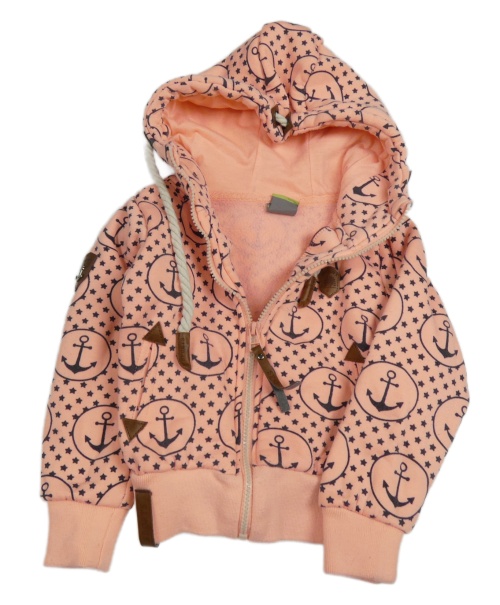 Broskvová propínací teplá mikina s kotvami a hvězdičkami a nášivkami a kapucí
