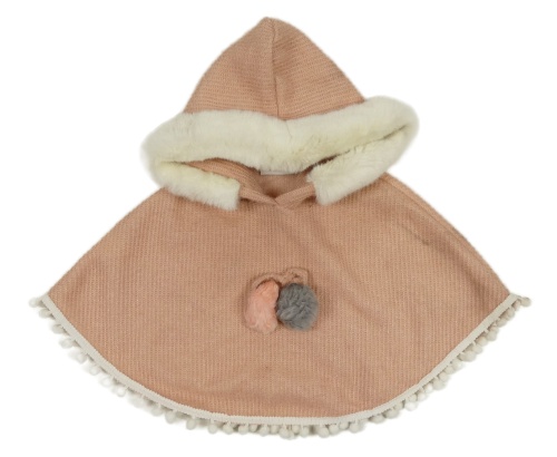 Růžové svetrové pončo s bambulemi a kapucí s kožešinou a třásněmi
