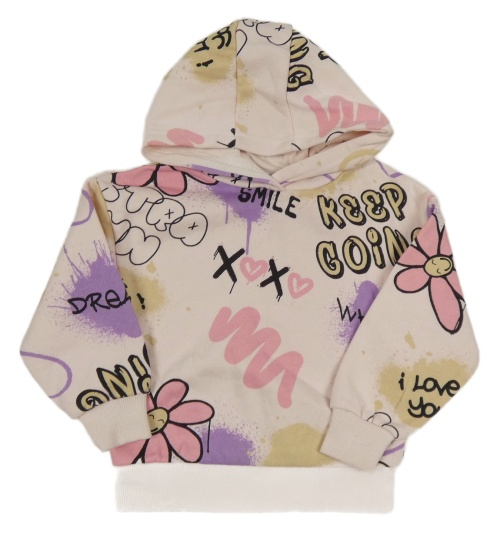 Světlerůžová mikina s květy a srdíčky a graffiti nápisy a kapucí PRIMARK