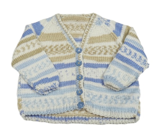 Bílo-modro-béžový vzorovaný propínací svetr