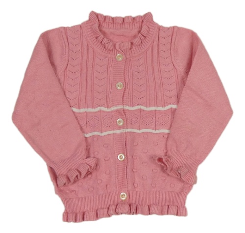 Růžový propínací svetr s perforovaným vzorem a puntíky
