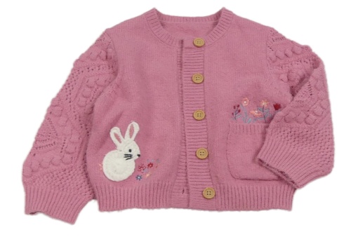 Růžový propínací svetr s králíčkem a kytičkami a perforovanými rukávy Nutmeg