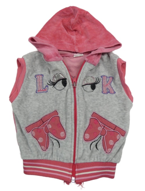Šedo-růžová melírovaná sametová propínací vesta s očima a mašlemi a kapucí