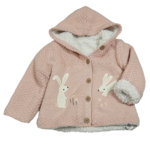 Pudrový propínací zateplený svetr s králíčky a třpytkami a kapucí Nutmeg