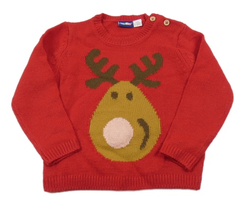Červený pletený svetr se sobem a blikátkem a medodií lupilu