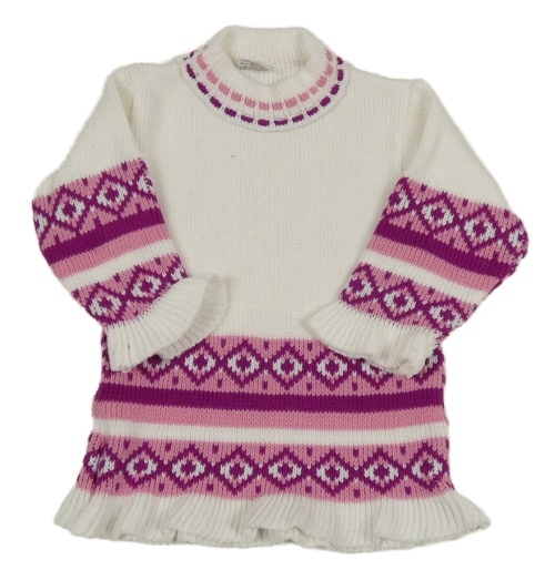 Bílo-růžovo-borůvkový vlněný rolák se vzorem a volánky