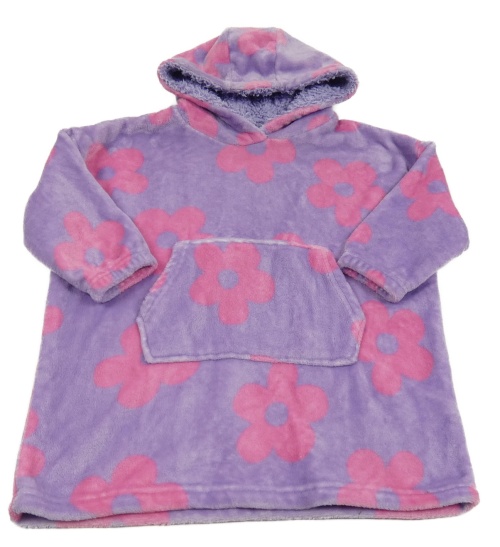 Lila chlupatá oversize mikina s květy a kapucí