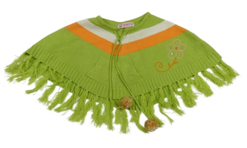 Zeleno-bílo-oranžové svetrové pončo s kytičkou a kapsou a třásněmi a bambulemi