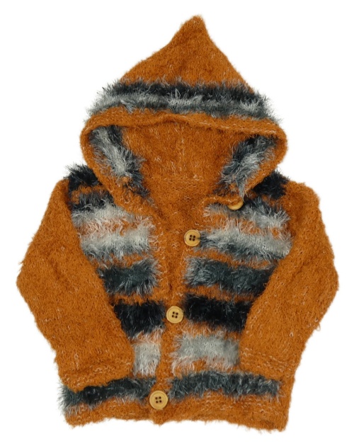 Rezavo-šedý chlupatý propínací svetr s kapucí