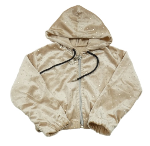 Světlebéžová sametová propínací crop mikina s kamínky a kapucí