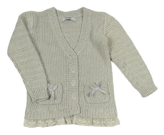 • Světlešedo-stříbrný melírovaný propínací svetr s mašlemi a krajkovým volánkem a žebrováním George