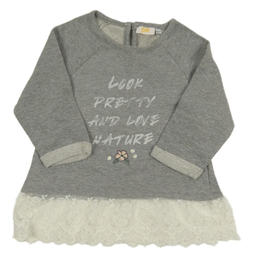 Šedo-bílá třpytivá tepláková tunika s nápisem a krajkovým volánkem Kids
