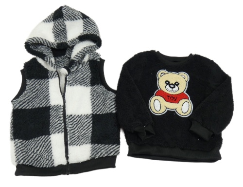 • 2set - Černo-bílá chlupatá kostkovaná vesta s kapucí + černá chlupatá mikina s medvídkem