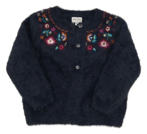 Tmavomodrý chlupatý propínací svetr s kytičkami