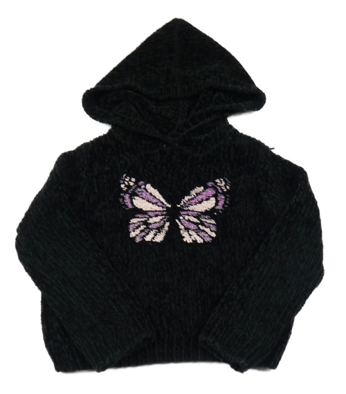 Černý melírovaný žinylkový svetr s motýlkem z překlápěcích flitrů a kapucí dopodopo