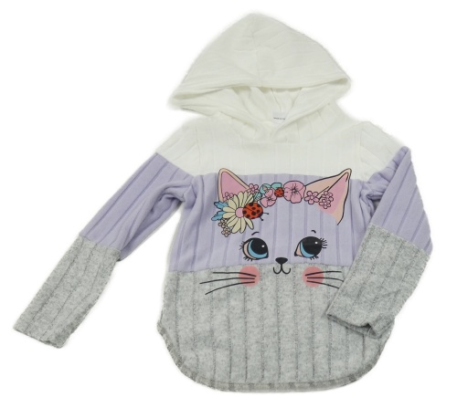 Fialovo-šedo-bílá žebrovaná úpletová mikina s kočičkou a kapucí