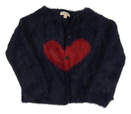 Tmavomodrý chlupatý propínací svetr se srdcem