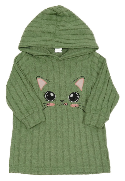 Zeleno-šedý melírovaný žebrovaný svetr s kočkou a kapucí