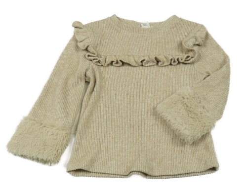 Béžové žebrované úpletové triko s volánkem a kožešinovým lemem River Island