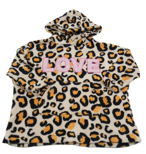 Pudrovo-černo-oranžová vzorovaná plyšová oversize dlouhá mikina s nápisem a kapsou a kapucí MISO