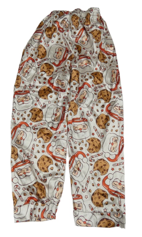 Smetanové saténové pyžamové vánoční kalhoty se Santy/hrníčky a sušenkami