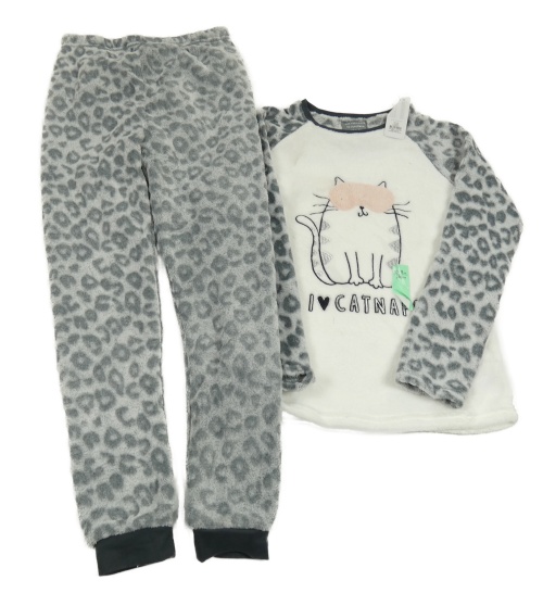 Nové - bílo-šedé vzorované plyšové pyžamo s kočkou Primark