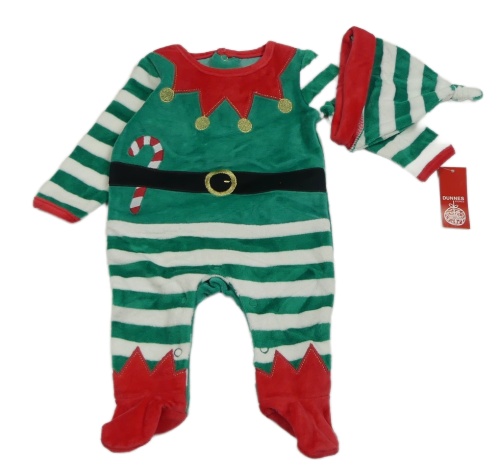 • Nové- 2set- Zeleno-bílý pruhovaný sametový overal- skřítek+ čepice Dunnes