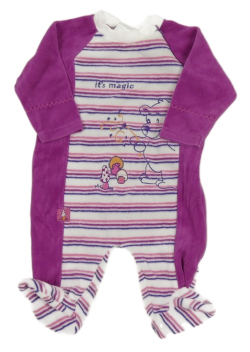 Purpurovo-bílo-pruhovaný sametový overal s nápisem a medvědem
