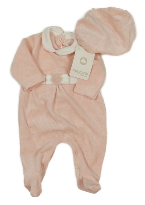 Nové - 2set - Světlerůžovo-bílý sametový overal s mašlí + čepice Mayoral