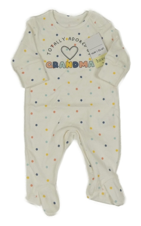 Nové - bílo-barevný puntíkatý overal s nápisy a srdíčkem Matalan