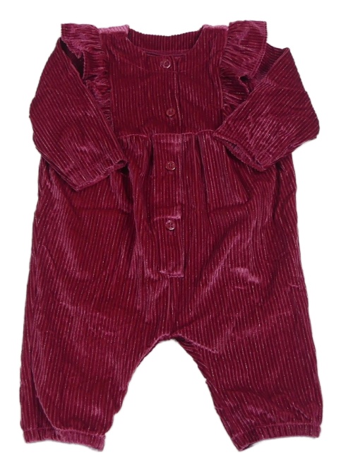 Vínovo-třpytivý žebrovaný sametový overal s volánky George