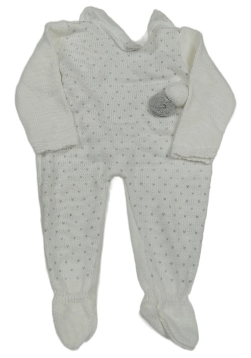 Bílo-šedý vzorovaný pletený overal s bambulkami a límečkem