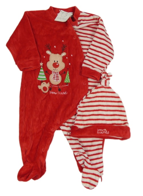 Nové - 2set - Červeno-pruhovaný sametový overal se sobem + čepice Ear