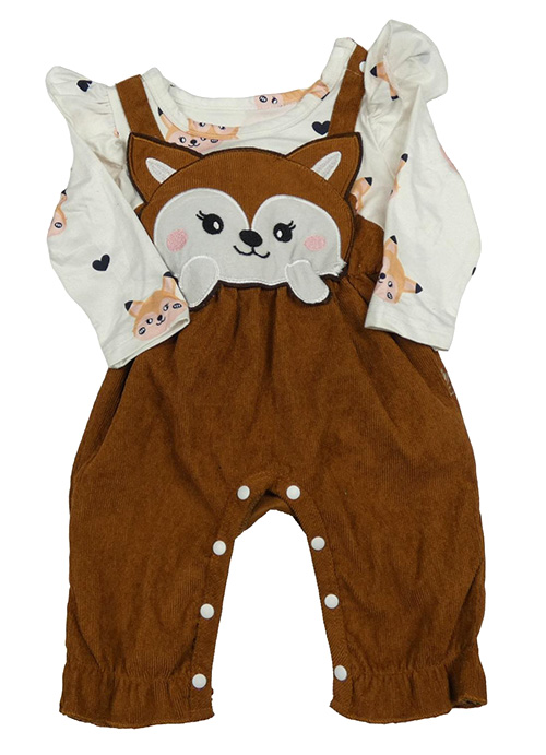 Hnědý lehký manšestrový overal s bílými rukávy s liškami
