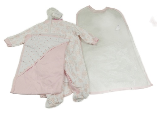 Nové - 7pack - Bílo-růžový overal + body + deka + bryndák + usínáček + ponožky + čepice