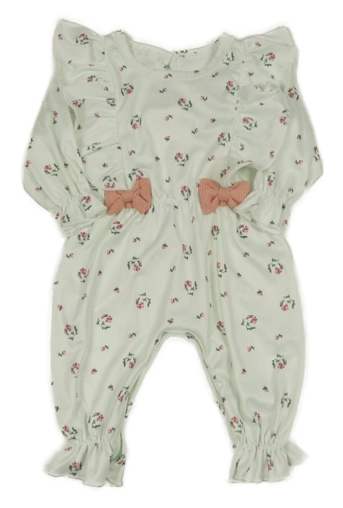 Mintový žebrovaný květovaný overal s volánky a mašlemi