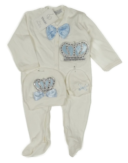 Nové - 3Set - Bílý overal s korunkou s kamínky a mašlí + čepice + rukavice Vivaki