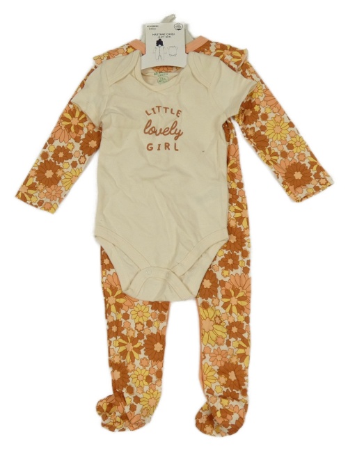 Nový - 2set - hnědo-oranžový květovaný overal + béžové body s nápisem