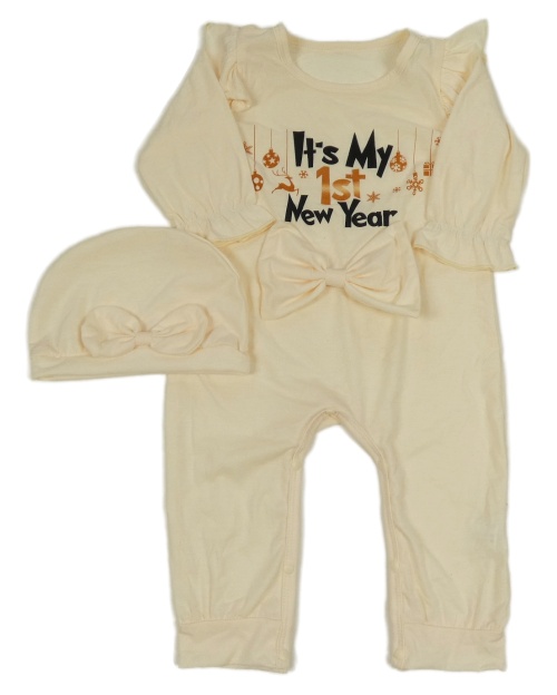 2 set - smetanový overal s nápisem a mašlí + lehká čepice s mašlí