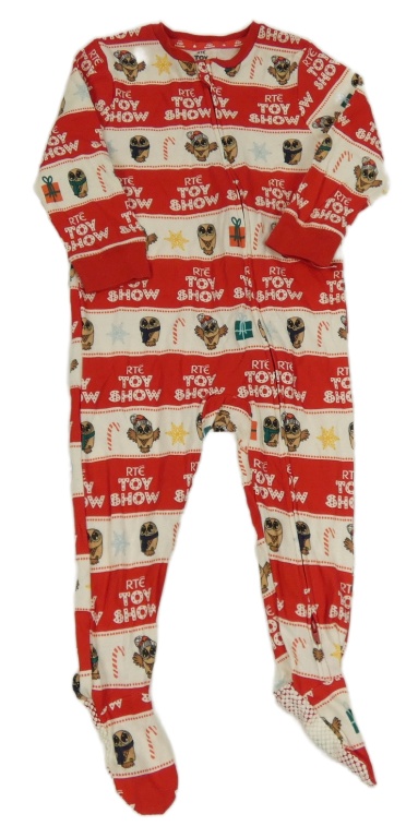 Červeno-bílý pruhovaný overal se sovami a nápisy