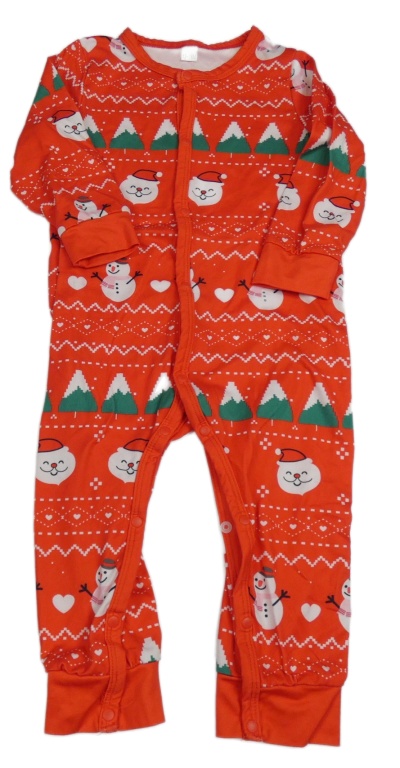 Červený vzorovaný vánoční overal se Santy a stromečky a sněhuláčky