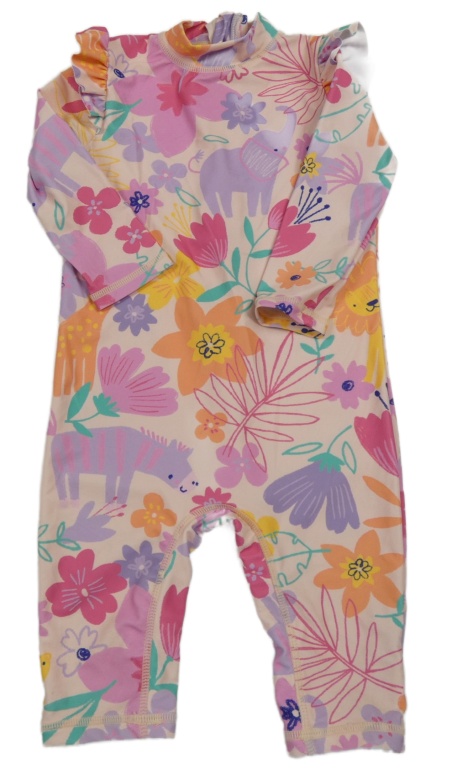 Světlepudrový UV overal s kytičkami a zvířátky a volánky Nutmeg