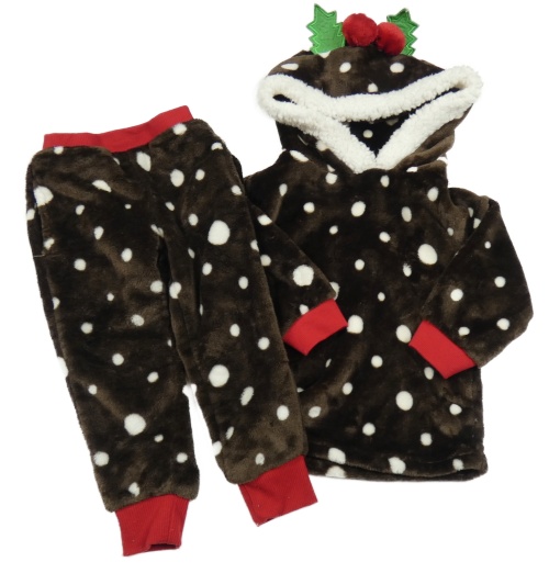 2Set - Tmavohnědo-bílo-červená puntíkatá plyšová domácí vánoční mikina s kapucí + kalhoty