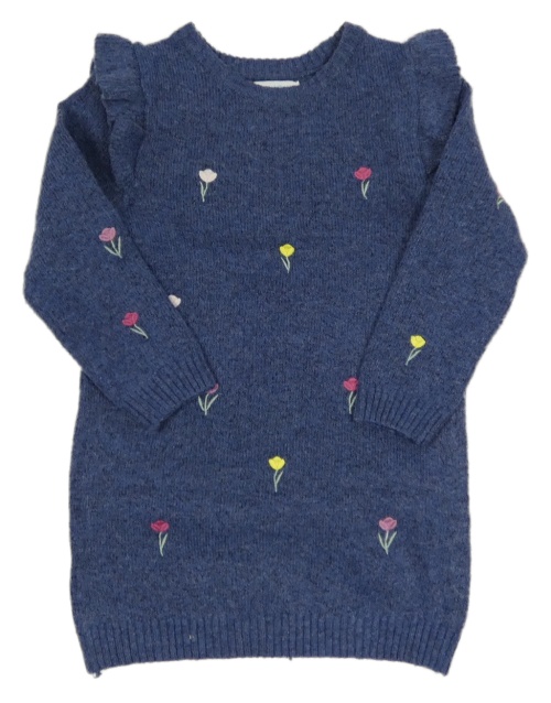 Tmavomodré pletené svetrové šaty s výšivkami květů a volánky Primark