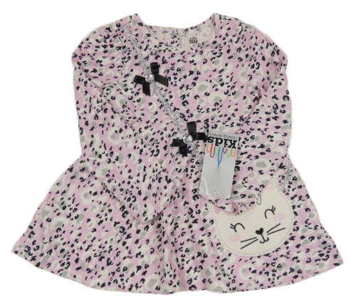 Nové - Růžovo-šedé vzorované šaty s kočkou a mašličkami