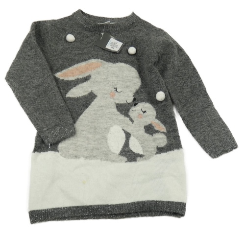Nové - tmavošedo-bílé melírované svetrové šaty s králíčky a bambulkami PRIMARK