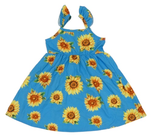 Modré letní šaty se slunečnicemi a volánky