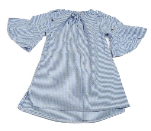 Modro-bílé pruhované krepové šaty s perlami a mašlí a rozšířenými rukávy