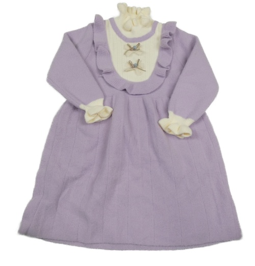 Světlefialovo-smetanové svetrové šaty s mašlemi a volánkem a rolákem