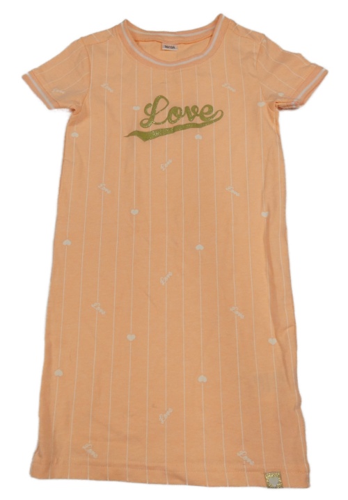 Oranžové pruhované šaty se zlatým nápisem
